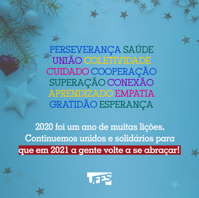 Desejamos a todos e todas, em especial aos nossos queridos colegas da Ufes, estudantes, professores e técnicos, momentos felizes de congraçamento neste fim de ano, com os devidos cuidados de proteção, e que em 2021 estejamos de volta encorajados e confiantes de que conseguiremos alcançar nossos desejos de saúde, paz, mais justiça social e mais educação de qualidade.