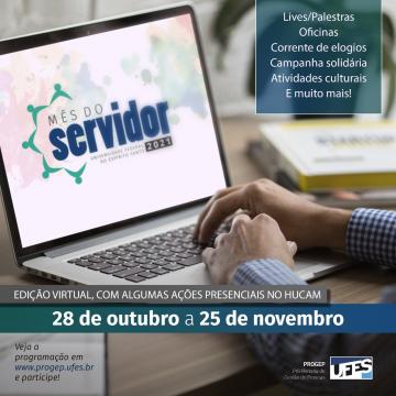O Mês do Servidor é uma ação promovida pela Pró-Reitoria de Gestão de Pessoas (Progep), com eventos a cada semana entre os meses de outubro e novembro. Com conteúdo variado, as atividades são realizadas nos formatos virtual e presencial, e são abertas a todos os servidores da Ufes.