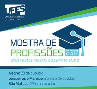 A Mostra de Profissões 2017 começou no campus de Alegre na segunda-feira, dia 23. Em Vitória, ela será realizada no campus de Maruípe no dia 25 e em Goiabeiras nos dias 25 e 26 de outubro. No campus de São Mateus, a Mostra está agendada para o dia 9 de novembro.