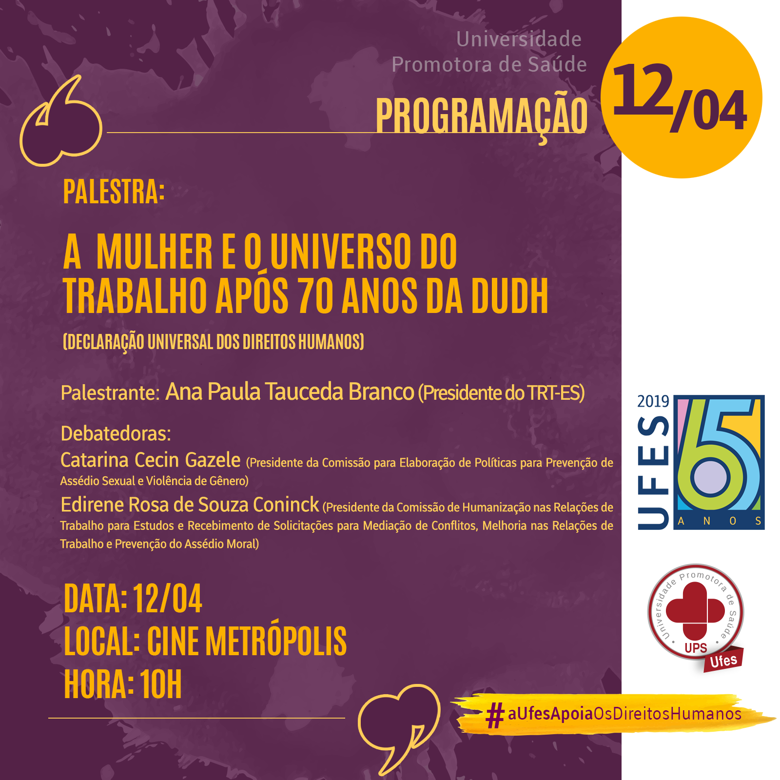 “A Mulher e o Universo do Trabalho após 70 anos da Declaração Universal dos Direitos Humanos” é o tema da palestra a ser ministrada pela presidente do Tribunal Regional do Trabalho no Espírito Santo (TRT-ES), Ana Paula Tauceda, nesta sexta-feira, 12, a partir das 10 horas, no Cine Metrópolis.