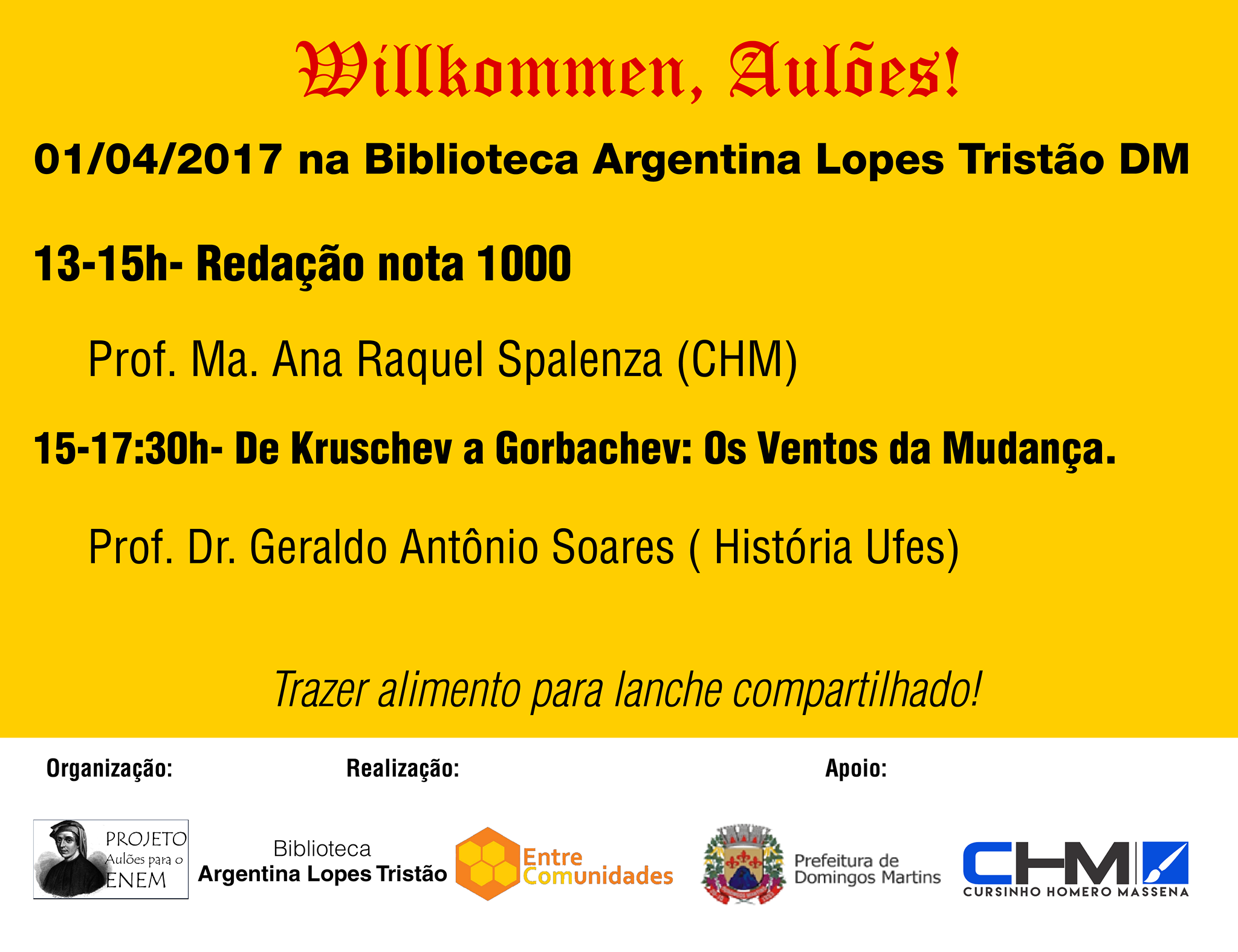 Neste sábado, o projeto leva a Domingos Martins uma aula com a professora Ana Rachel Spalenza, que vai trabalhar o tema "Redação nota Mil", e uma palestra com o professor do Departamento de História da Ufes, Geraldo Antônio Soares, que abordará o contexto da guerra fria na Alemanha.