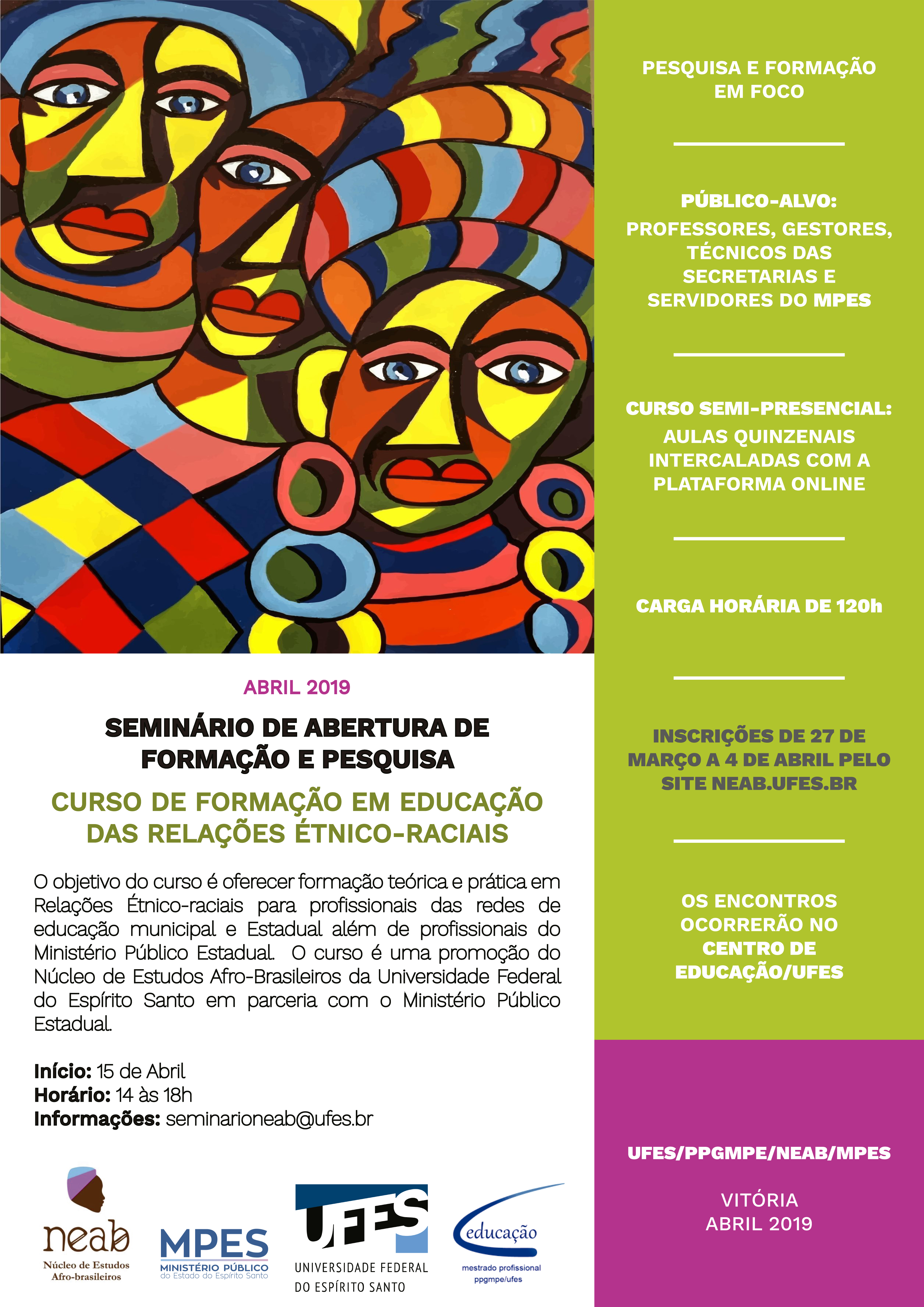 O Núcleo de Estudos Afro-Brasileiros (Neab) da Ufes está com inscrições abertas para o curso semipresencial de Formação em Educação das Relações Étnico-Raciais. Ao todo, o curso de extensão e pesquisa terá carga horária de 120 horas. Serão ofertadas 30 vagas para bolsistas do Programa Residência Pedagógica e servidores do Ministério Público Estadual, e das secretarias de Educação dos municípios de Anchieta, Cariacica, Guarapari, Serra, Piúma, Viana e Vila Velha. Os interessados podem se inscrever até 4 de abril, no site do Neab (clique aqui).