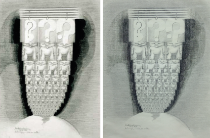 Dentre as criações restauradas, destacam-se uma gravura feita utilizando a técnica de serigrafia, produzida em 1983 por Fayga Ostrower (foto principal, após a restauração; abaixo, antes do processo), uma das mais importantes artistas do Brasil; e dois desenhos feitos com o material grafite, ambos criados em 1977 por Maria Helena Lindenberg, artista de intensa atuação cultural na Ufes e em Vitória, tendo exposto suas obras no Brasil e nos Estados Unidos.
