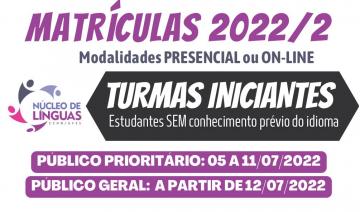O Núcleo de Línguas da Ufes abriu nesta terça-feira, 5, o período de matrícula para estudantes que queiram ingressar em um curso de línguas no nível iniciante no segundo semestre de 2022. Podem se matricular estudantes da rede pública matriculados no ensino fundamental, médio e superior (incluindo estudantes da Ufes da graduação ou pós-graduação) e alunos de nível superior de instituições privadas, desde que sejam beneficiários de bolsas de estudos 100% dos programas sociais do governo federal, estadual ou municipal.