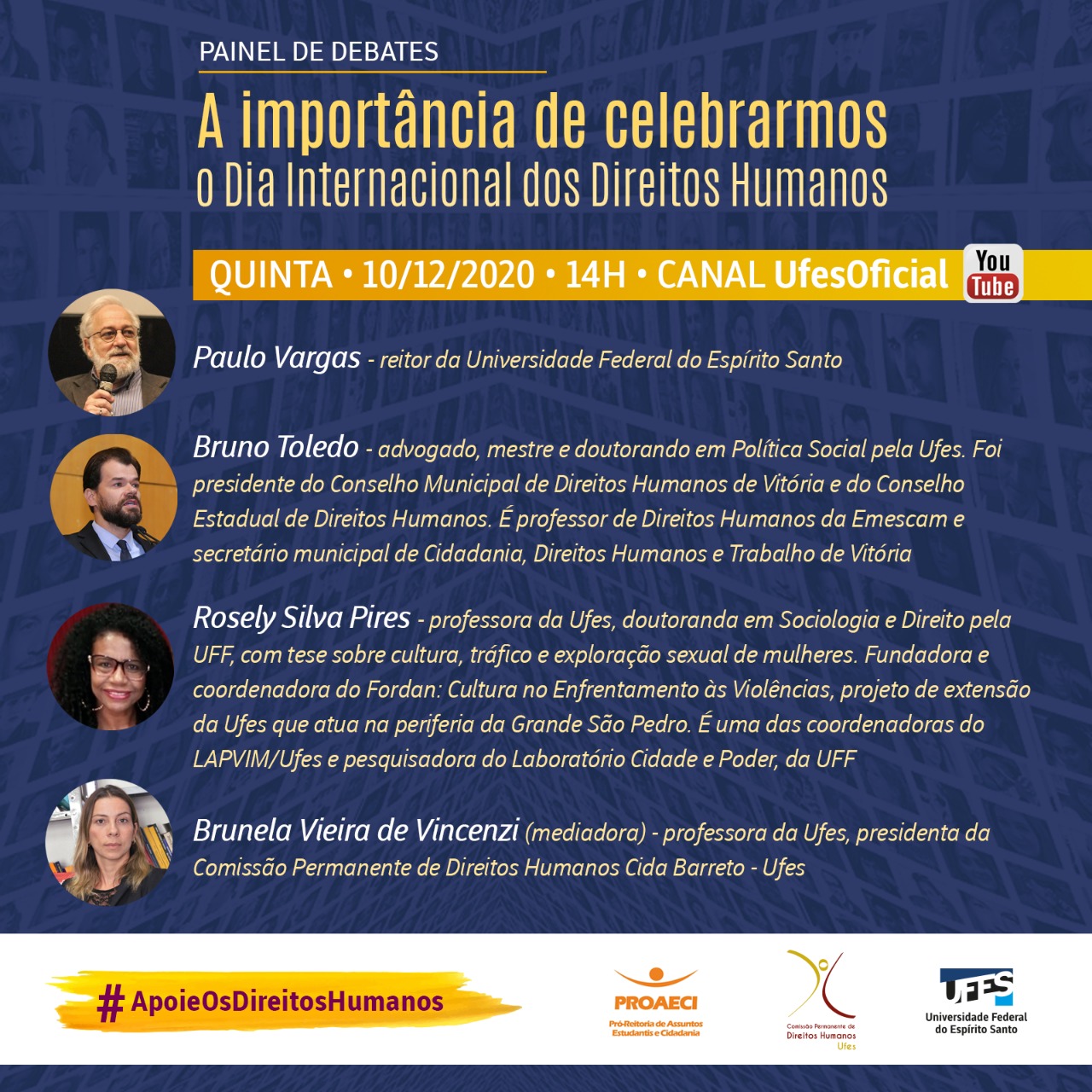 As iniciativas que buscam o respeito aos direitos humanos ganham destaque na agenda de eventos da Ufes desta semana, com a realização de um painel de debates nesta quinta-feira, 10, a partir das 14 horas. Com o tema A importância de celebrarmos o Dia Internacional dos Direitos Humanos, o debate virtual será transmitido pelo canal da Ufes no YouTube. O dia 10 de dezembro é a data em que se comemora mundialmente os direitos humanos. O evento terá a participação do reitor Paulo Vargas e a mediação da professora do Departamento de Direito Brunela Vincenzi, presidente da Comissão Permanente de Direitos Humanos da Ufes Cida Barreto.
