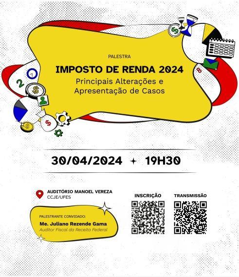O Núcleo de Apoio Contábil e Fiscal (NAF) da Ufes realiza na terça-feira, 30, a palestra Imposto de Renda 2024: principais alterações e apresentação de casos. O evento acontece a partir das 19h30 no auditório Manoel Vereza, no Centro de Ciências Jurídicas (CCJE), no campus de Goiabeiras, e terá como palestrante o auditor fiscal da Receita Federal no Espírito Santo Juliano Rezende.