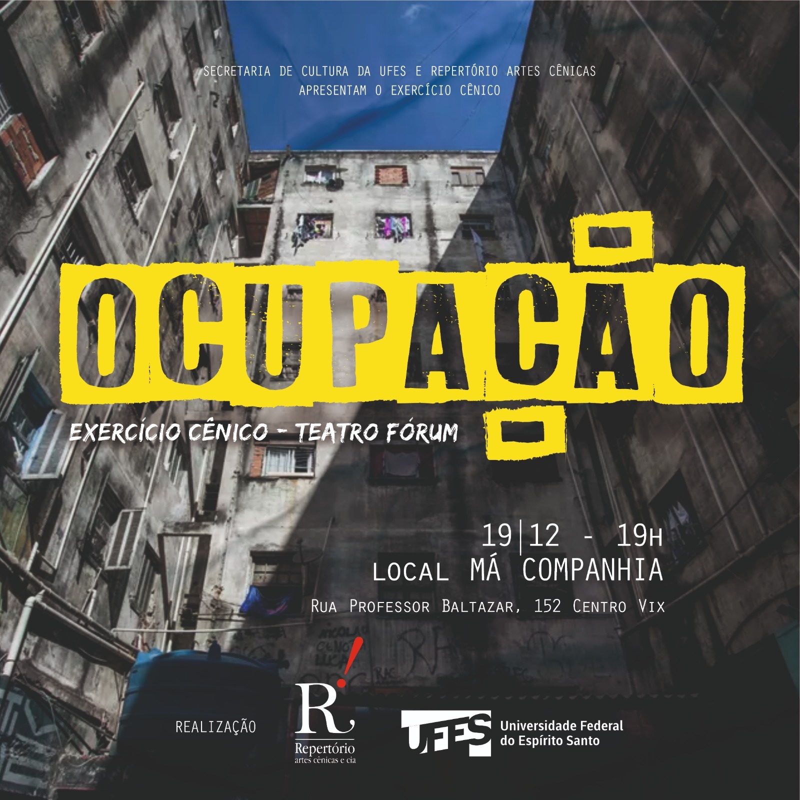 A Oficina de Práticas Teatrais, realizada pela Repertório Artes Cênicas e Cia em parceria com a Secretaria de Cultura da Ufes (Secult-Ufes), encerra seu segundo módulo nesta terça-feira, 19, com a apresentação do exercício cênico Ocupação. A peça acontece às 19 horas no espaço Má Companhia, localizado na Rua Professor Baltazar, 152, no Centro de Vitória. A entrada é gratuita.