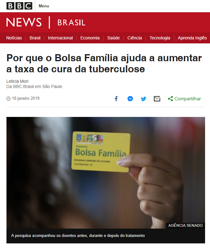 A matéria, intitulada “Por que o Bolsa Família ajuda a aumentar a taxa de cura da tuberculose” traz entrevista com a professora Ethel, explicando detalhes sobre o estudo realizado com apoio da Organização Mundial de Saúde (OMS), que tem um projeto global de combate à enfermidade, incentivando pesquisas sobre medicamentos e tratamentos. Confira no link: https://www.bbc.com/portuguese/brasil-46878593.