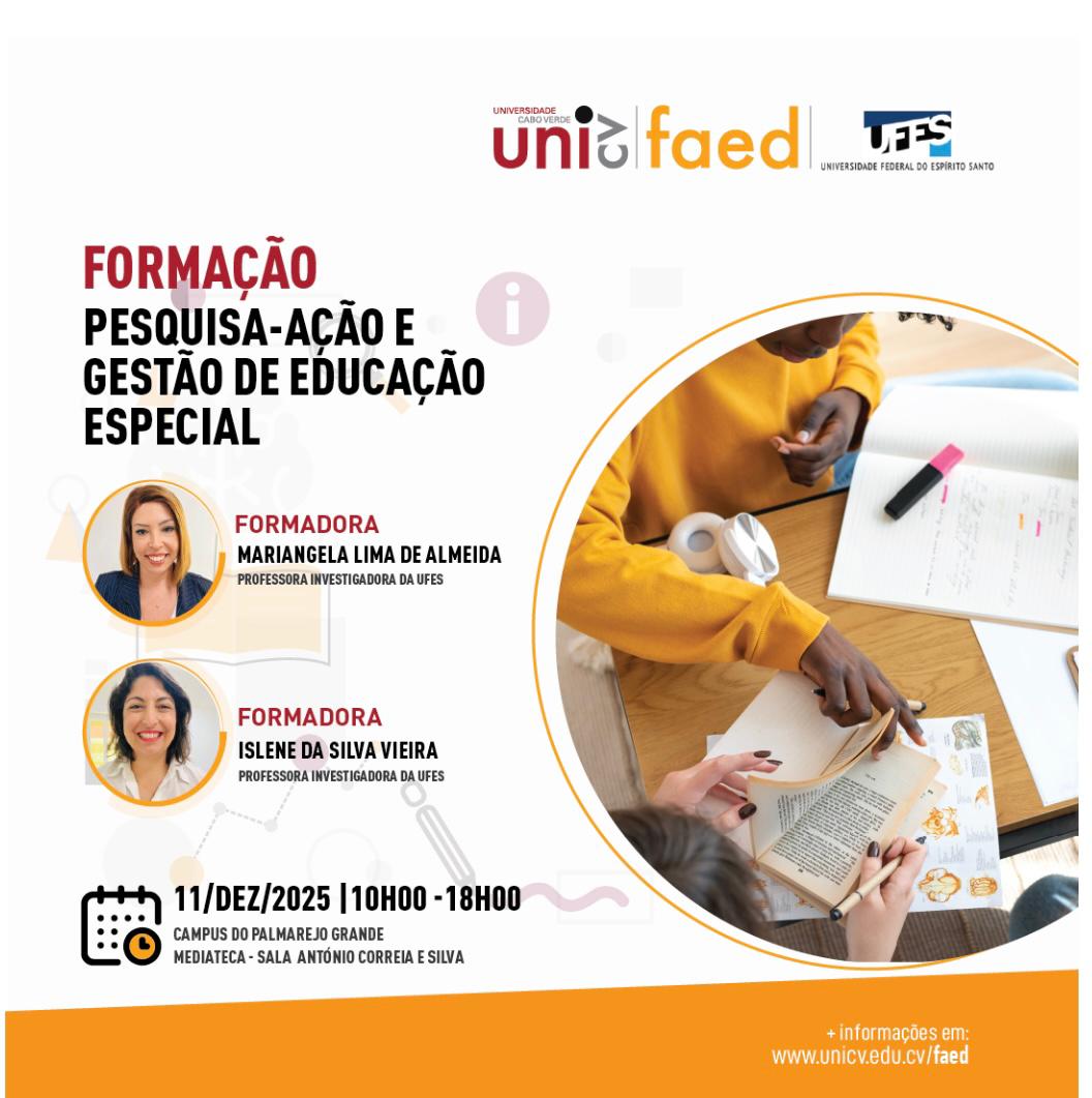 A professora do Centro de Educação Mariangela de Almeida e a doutoranda do Programa de Pós-Graduação em Educação (PPGE) Islene Vieira ministram nesta quinta-feira, 11, a formação Pesquisa-Ação e Gestão de Educação Especial, na Faculdade de Educação e Desporto da Universidade de Cabo Verde (Uni-CV). A formação, dirigida a estudantes e docentes da Uni-CV, é fruto de uma parceria entre a instituição e o PPGE/Ufes.