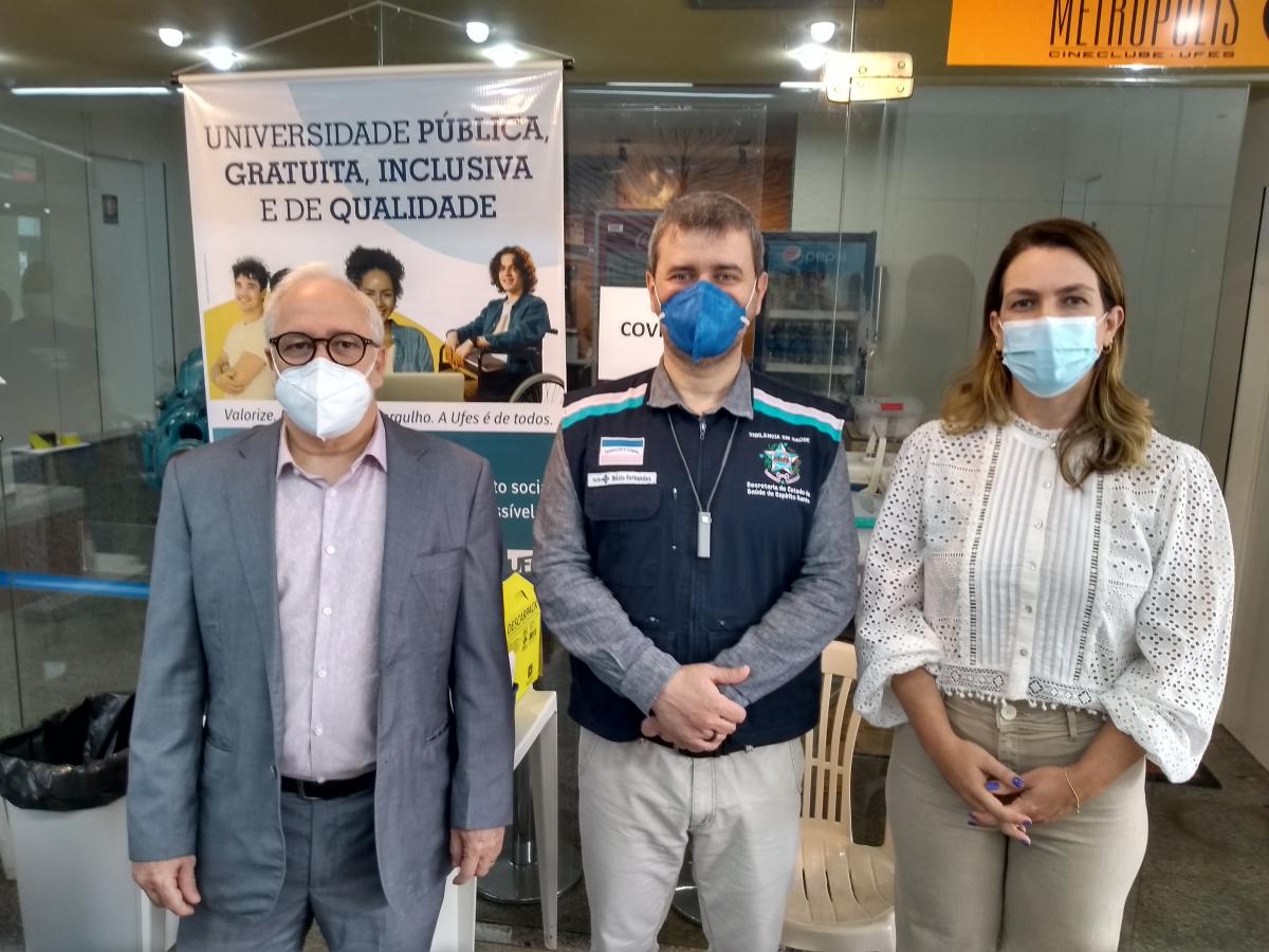Cerca de 3 milhões de capixabas já tomaram ao menos uma dose de vacina contra a covid, porém é necessário ampliar esse número à medida que as atividades presenciais são retomadas. “Há uma circulação diária de cerca de 1 milhão de pessoas em Vitória, por isso é muito importante vacinar todos, inclusive os que estão de passagem. As pessoas necessitam estar com a sua imunidade em dia para um retorno com maior segurança às salas de aula”, explica a coordenadora de Vigilância Epidemiológica da Prefeitura de Vitória, Tatiana Cometti (na foto à esquerda, junto ao reitor da Ufes à direita e o secretário de Estado de Saúde ao centro).