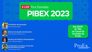 Nesta terça-feira, 4, a  partir das 19 horas, em seu canal Youtube, a Pró-Reitoria de Extensão realiza uma live tira dúvidas sobre o edital do Programa Integrado de Bolsas para Estudantes de Graduação - PIBEx 2023. Apresentarão a live o pró-reitor de Extensão, Renato Neto; o diretor de Gestão da Extensão, Athelson Bittencourt; a diretora de Políticas Extensionista, Fabiana Ramos; e a presidente da Comissão Permanente de Heteroidentificação da Ufes, Jacyara Paiva.