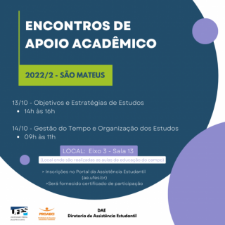 Já os Encontros de Apoio Acadêmico são destinados a estudantes de graduação da Ufes e serão divididos em dois momentos. O primeiro, intitulado Objetivos e Estratégias de Estudos, abordará assuntos como aprendizagem significativa; organização do material, dos conteúdos e do ambiente de estudos; o que fazer antes, durante e depois das aulas; e estratégias para maximizar a aprendizagem e autorregulação da aprendizagem. O segundo encontro, com o tema Gestão do Tempo e Organização dos Estudos, discutirá questões como planejamento de estudos; orientações para organizar o tempo e criar uma rotina de estudos; procrastinação e estratégias para vencê-la; e ferramentas para gestão do tempo.