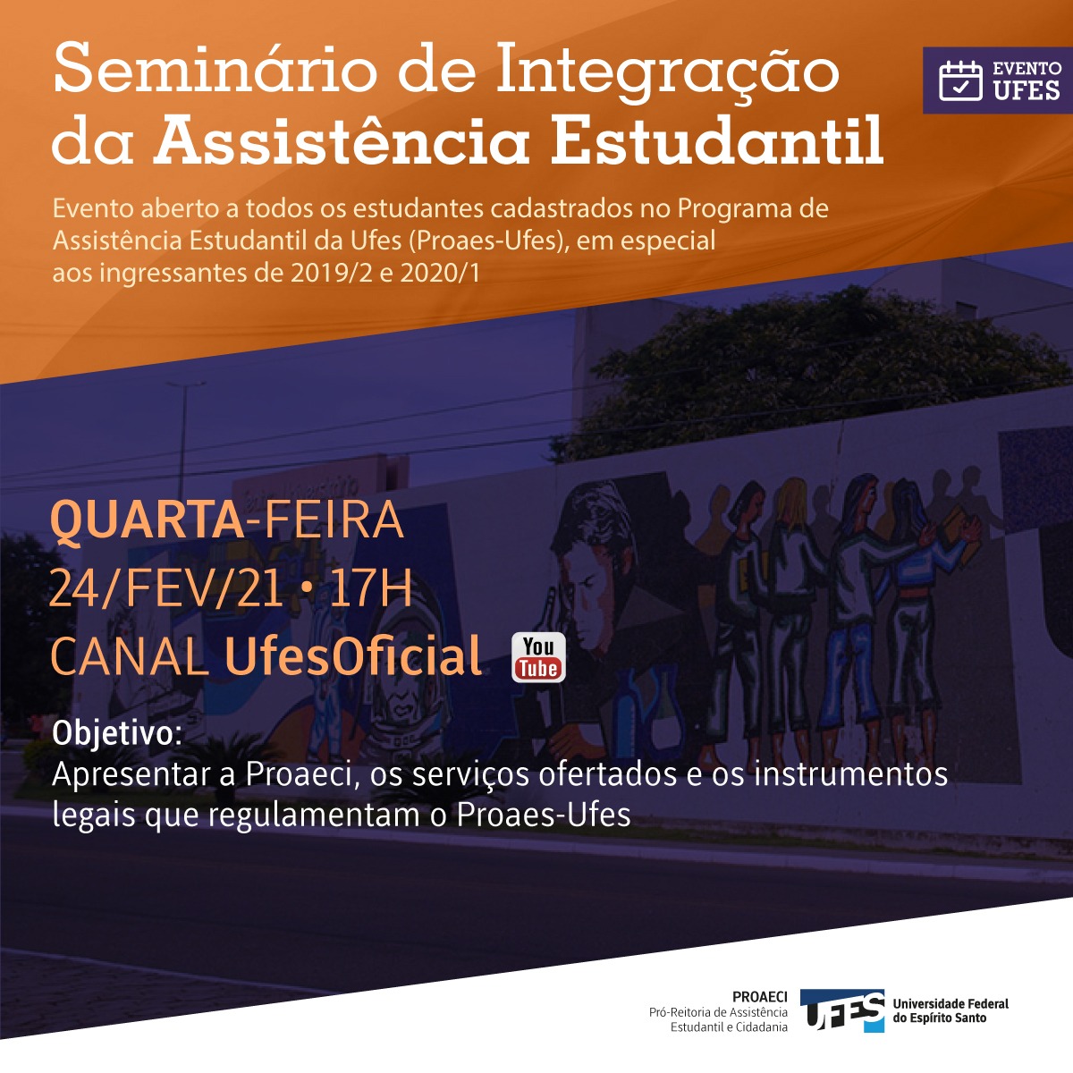 A Pró-Reitoria de Assuntos Estudantis e Cidadania (Proaeci) realiza nesta quarta-feira, 24, o Seminário de Integração da Assistência Estudantil, dirigido aos estudantes cadastrados no Programa de Assistência Estudantil da Ufes (Proaes-Ufes), especialmente aos que ingressaram no programa no segundo semestre de 2019 (2019/2) e no primeiro semestre de 2020 (2020/1).