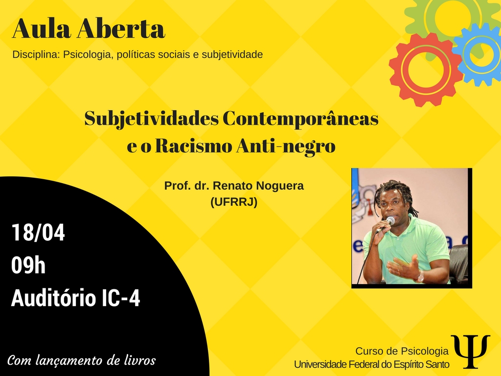 O curso de Psicologia da Ufes realiza nesta terça-feira, 18, uma aula aberta com o professor da Universidade Federal Rural do Rio de Janeiro (UFRRJ), Renato Noguera, sobre o tema “Subjetividades contemporâneas e o racismo anti-negro". A aula tem início às 9 horas, no auditório do Centro de Educação, no prédio IC-4, campus de Goiabeiras.