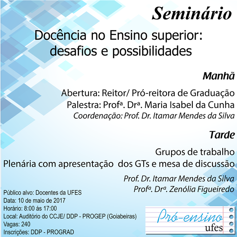 A Pró-Reitoria de Graduação (Prograd), por meio de seu Departamento de Desenvolvimento Pedagógico, realiza no dia 10 de maio o seminário “Docência no Ensino Superior: desafios e possibilidades”. O evento é dirigido aos professores que ingressaram na Ufes entre 2013 e 2017, e ocorrerá no auditório do Centro de Ciências Jurídicas e Econômicas (CCJE), das 8 às 17 horas.