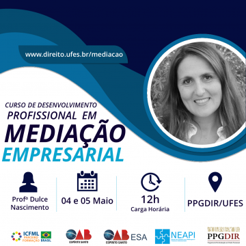 Nos dias 4 e 5 de maio, o Programa de Pós-Graduação em Direito realiza o curso de Desenvolvimento Profissional em Mediação Empresarial, ministrado pela diretora da Câmara de Mediação do Brasil (CMBR) Dulce Nascimento, mediadora certificada pelo International Mediation Institute (IMI) e pelo Instituto de Certificação e Formação de Mediadores Lusófonos (ICFML).