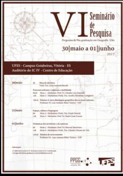 O Programa de Pós-Graduação em Geografia da Ufes realiza entre os dias 30 de maio e 1º de junho seu VI Seminário de Pesquisa. O objetivo é permitir o debate e a troca de experiências relativas às pesquisas em andamento no curso para a construção das dissertações e teses pelos estudantes do Programa.