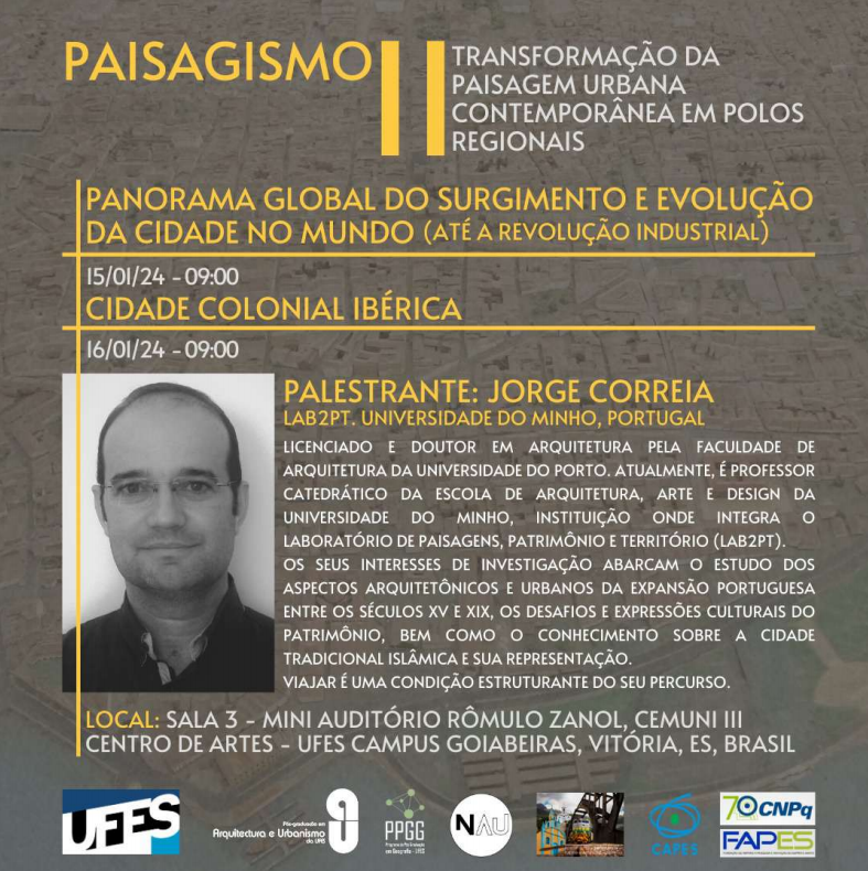 O seminário contará com a presença do professor da Universidade do Minho (Portugal) Jorge Correia, que falará sobre o Panorama Global do Surgimento e Evolução da Cidade no Mundo (até a Revolução Industrial), no dia 15; e sobre a Cidade Colonial Ibérica, no dia 16.