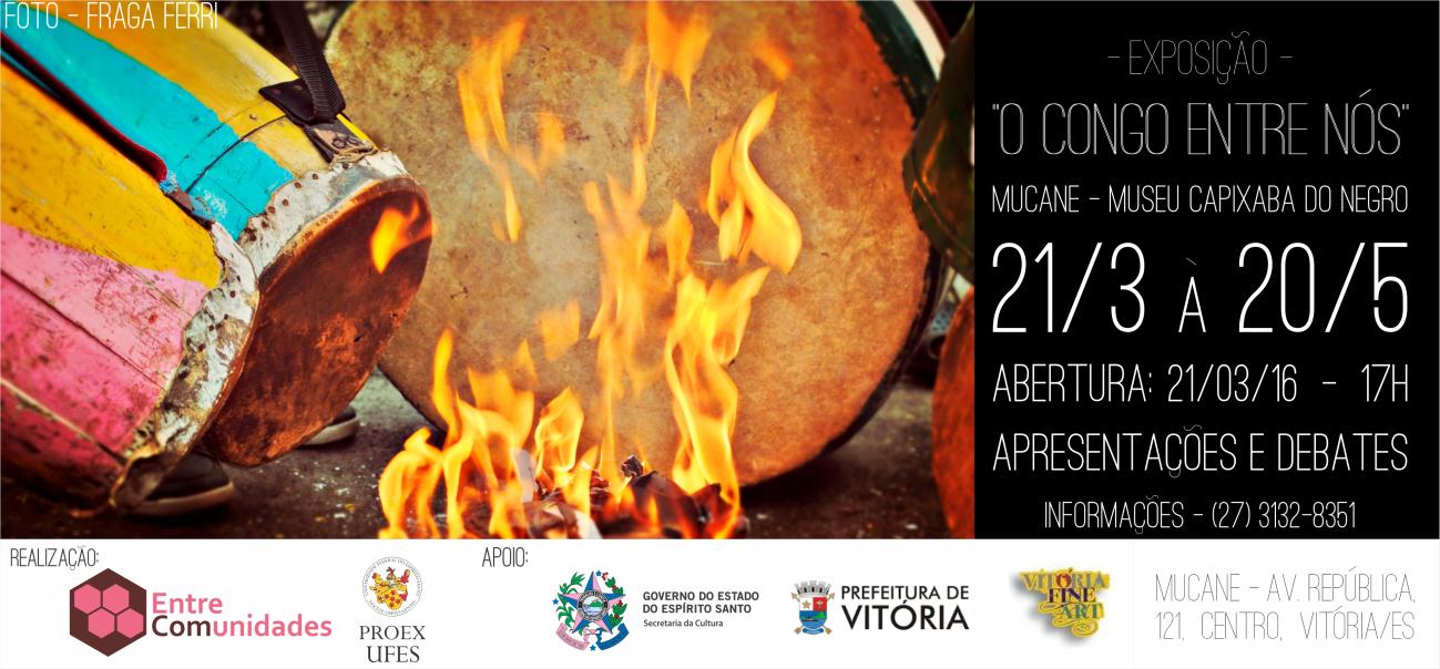 O Congo entre Nós é o nome da exposição que o programa de extensão Entre Comunidades apresenta no Museu Capixaba do Negro (Mucane), até o dia 20 de maio. São 30 fotografias das bandas de congo de Piabas/Irundí, da Comunidade Quilombola de São Pedro (ambas do Município de Ibiraçu), e das bandas Mirim São Benedito (Timbuí) e Mirim Santa Clara Estrela Guia (Fundão Sede). Os visitantes também poderão conferir na exposição as peças indumentárias e os instrumentos das manifestações festivas.