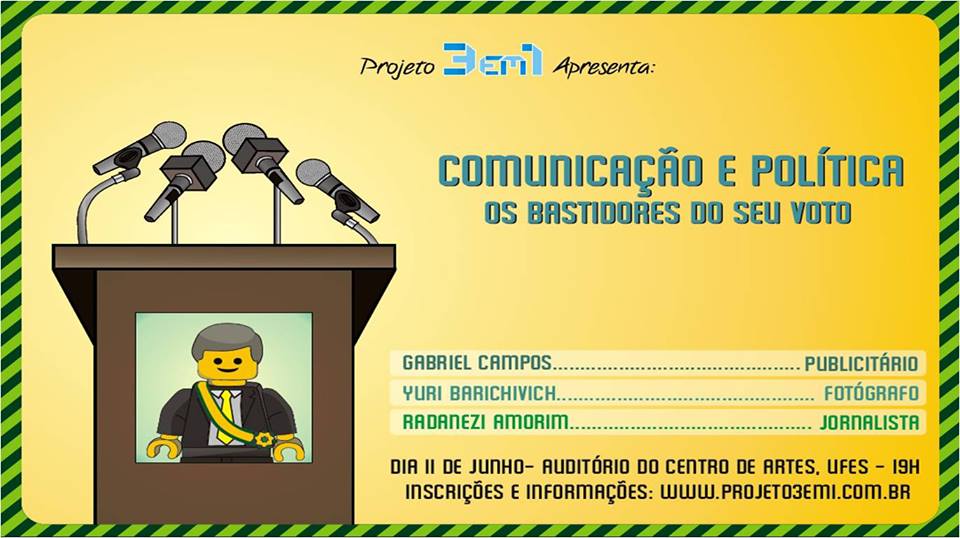 O projeto de extensão 3em1, do curso de Comunicação Social, promoverá na próxima quarta-feira, dia 11, a palestra “Comunicação e Política - Os bastidores do seu voto”, às 19 horas, no auditório do Centro de Artes.