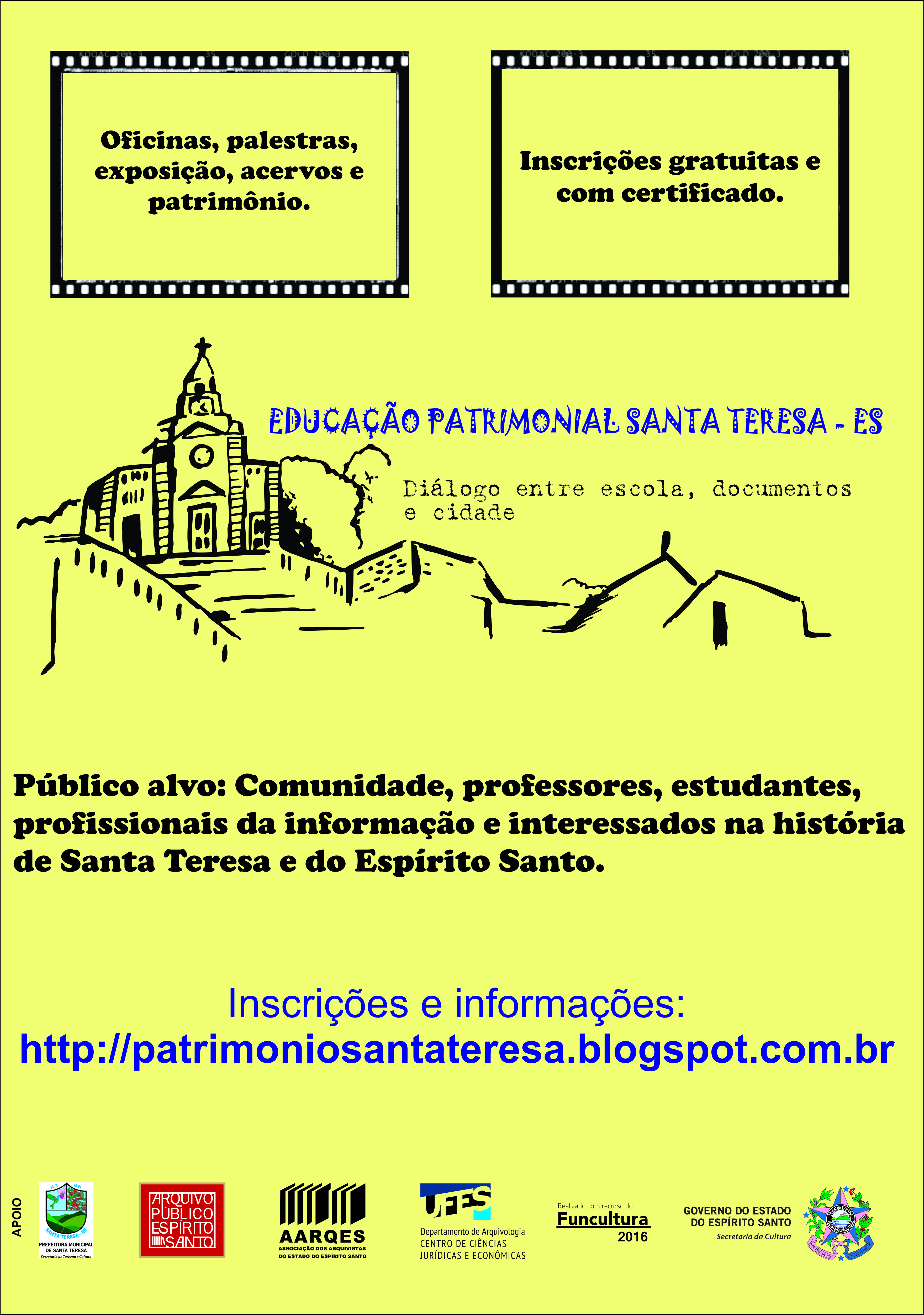 Todas as atividades são gratuitas e abertas ao público. Mais informações estão disponíveis no endereço eletrônico http://patrimoniosantateresa.blogspot.com.br .