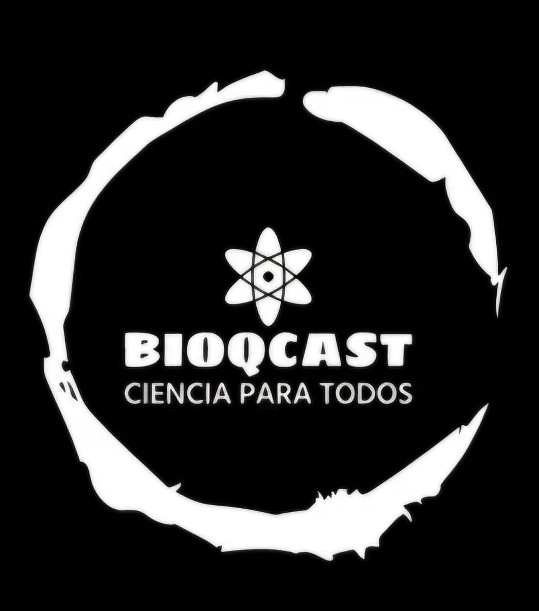 Logomarca do projeto: em um quadrado preto há um círculo branco e, dentro dele, em letras brancas, a inscrição Bioqcast, ciência para todos. Acima da palavra Bioqcast há o símbolo de um átomo.