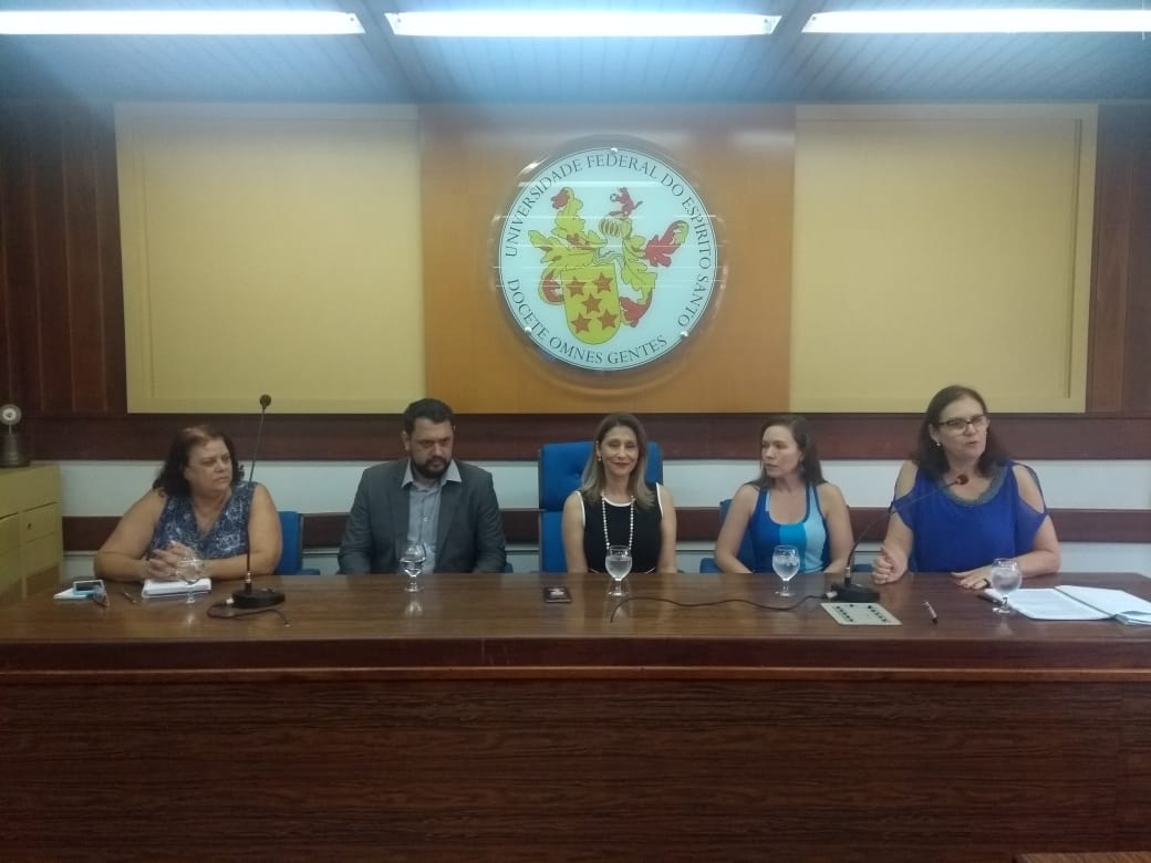 Na foto, a gerente de Qualificação Profissional da Secretaria de Estado da Educação, Ana Janete Viana; o pró-reitor de Extensão do Ifes, Renato Tannure; a vice-reitora da Ufes, Ethel Maciel; a professora do Departamento de Ciências Biológicas da Ufes e coordenadora do projeto, Viviana Corte; e a pró-reitora de Extensão da Ufes, Tânia Delboni.