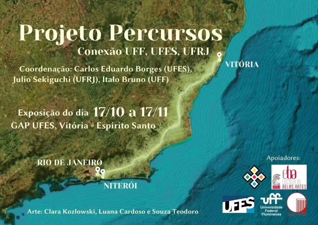 Estudantes da Universidade Federal do Rio de Janeiro (UFRJ) e da Universidade Federal Fluminense (UFF) participam de exposição coletiva na Galeria de Arte e Pesquisa da Ufes (GAP), até o dia 17 de novembro. A mostra faz parte do projeto de extensão Percursos, coordenado pelos professores Italo Bruno, do Departamento de Arte da UFF, Julio Sekiguchi, da Escola de Belas Artes da UFRJ, e Carlos Eduardo Borges, chefe do Departamento de Artes Visuais da Ufes, que promove um intercâmbio entre os artistas das universidades. Em março, estudantes da Ufes expuseram suas obras na Galeria Leuna Guimarães dos Santos, no campus da UFF.