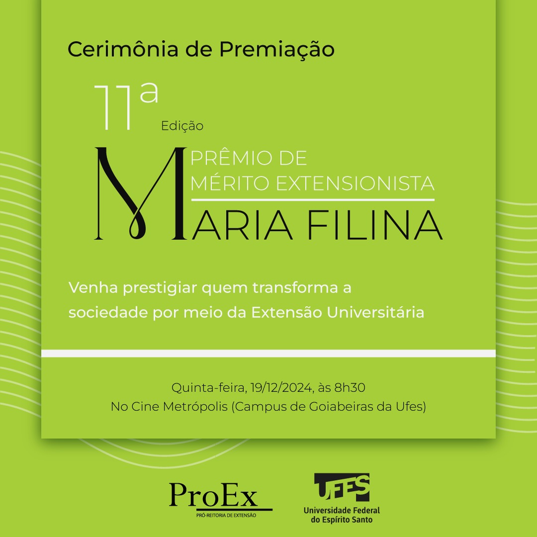 A Pró-Reitoria de Extensão divulgou nesta segunda-feira, 16, o resultado final do Prêmio de Mérito Extensionista Maria Filina. O vencedor geral desta 11ª edição foi o Núcleo de Apoio Contábil e Fiscal (NAF), coordenado pela professora Marília Nascimento, do Centro de Ciências Jurídicas e Econômicas (CCJE). Além do vencedor geral, há um vencedor por campus da Universidade – todos os vencedores e finalistas serão homenageados na cerimônia de premiação que será realizada nesta quinta, 19, às 8h30, no Cine Metrópolis, no campus de Goiabeiras.