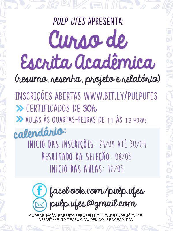 As aulas serão realizadas semanalmente às quartas-feiras, das 11 às 13 horas, a partir do dia 10 de maio, sendo ministradas por dois monitores do curso de Letras. As inscrições vão até o dia 30 de abril e devem ser feitas por meio de um formulário online no site http://bit.ly/pulpufes .