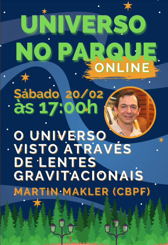 Neste sábado, 20 de fevereiro, acontece mais uma edição do projeto Universo no Parque. Desta vez, o projeto abordará o tema O Universo visto através de lentes gravitacionais, com palestra ministrada pelo pesquisador do Instituto de Cosmologia, Relatividade e Astrofísica do Centro Brasileiro de Pesquisas Físicas (CBPF) Martín Makler.