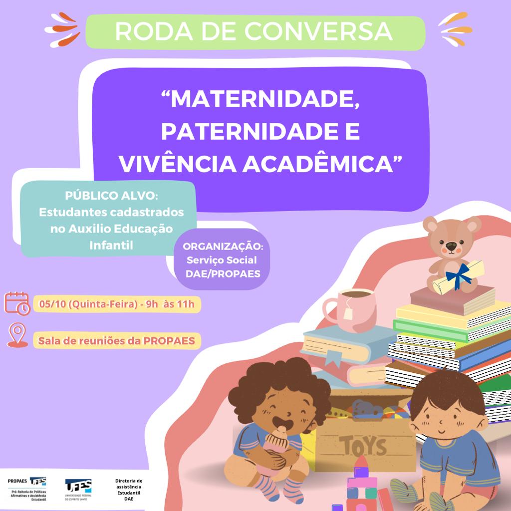 A equipe de Serviço Social da Diretoria de Assistência Estudantil (DAE) da Pró-Reitoria de Políticas Afirmativas e Assistência Estudantil (Propaes) promove nesta quinta-feira, 5, das 9 às 11 horas, uma roda de conversa com o tema Maternidade, paternidade e vivência acadêmica. O evento é dirigido aos estudantes cadastrados no Auxílio Educação Infantil e será realizado das 9 às 11 horas, na Sala de Reunião da Propaes, localizada no prédio Castelinho, em frente ao portal de entrada 3, no campus de Goiabeiras.
