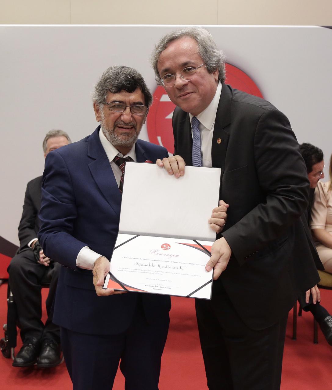 O reitor Reinaldo Centoducatte recebeu nesta quarta-feira, 4, uma homenagem da Associação Nacional das Instituições Federais de Ensino Superior (Andifes) por sua contribuição ao trabalho da entidade em defesa da educação pública, gratuita e de qualidade, e à construção de um sistema nacional, diverso e plural composto pelas 63 universidade federais. O reitor da Ufes presidiu a Andifes no período julho de 2018 a julho de 2019.