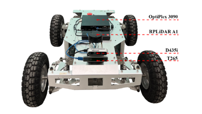 O robô possui um conjunto de câmeras que fazem estimativa de posição do robô e ao mesmo tempo mapeiam o ambiente. Além disso, para possibilitar a navegação autônoma, há a aplicação de um sensor que coleta informações para identificar obstáculos em volta de todo o robô, ajudando na navegação.
