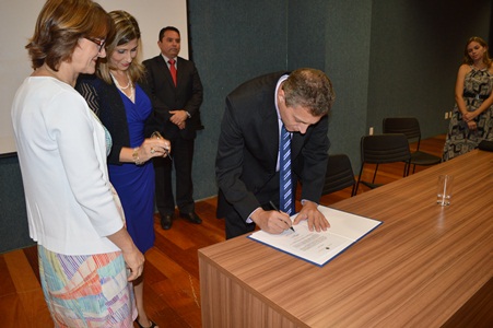 Na foto, o diretor Roney Silva assina o termo de posse na presença da pró-reitora de Gestão de Pessoas, Lúcia Casate (de branco) e da vice-reitora Ethel Maciel. Ao fundo, o diretor do Ceunes na gestão 2010-2014, Marcelo Suzart, e a vice-diretora empossada, Diógina Barata.