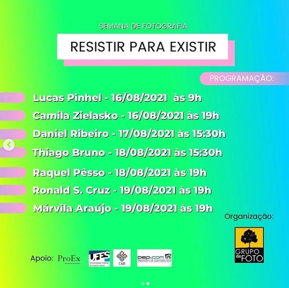 Começa na próxima segunda-feira, 16, a Semana de Fotografia 2021, evento virtual que visa promover o intercâmbio entre profissionais da fotografia, pesquisadores de imagem, estudantes e amantes da arte de fotografar. Organizada pelo projeto de extensão Grupo de Foto, a ação terá como tema Fotografia: resistir para existir e homenageará o Dia Mundial da Fotografia, celebrado em 19 de agosto. A Semana de Fotografia 2021 contará com conferência, oficinas, exposição virtual e concurso fotográfico.