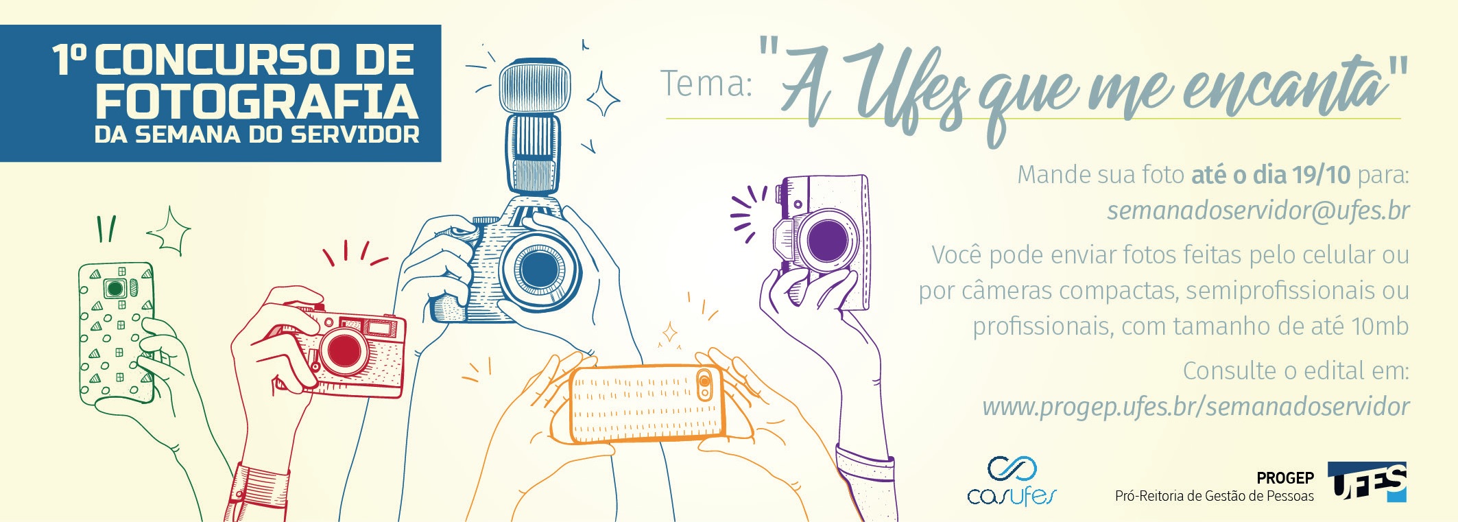 Estão abertas até o dia 19 de outubro as inscrições para o 1º concurso de fotografia da Semana do Servidor. Com o título "Ufes que me Encanta", o concurso tem como objetivo a produção de imagens que retratem a Universidade que está além do trabalho no dia a dia, suas paisagens e a vivência dos servidores dentro dessa paisagem.