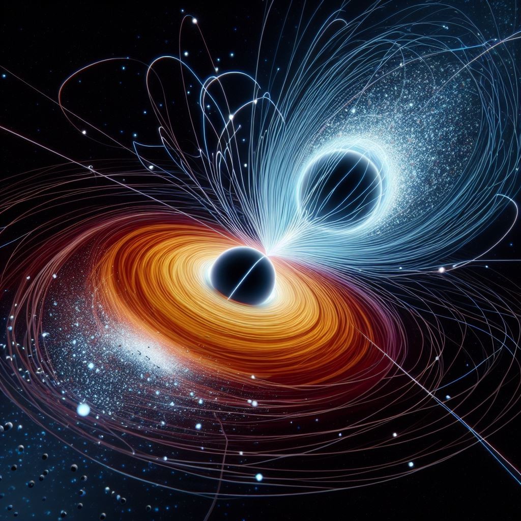Imagem ilustrativa de raios cósmicos nas cores azul e laranja em um céu negro