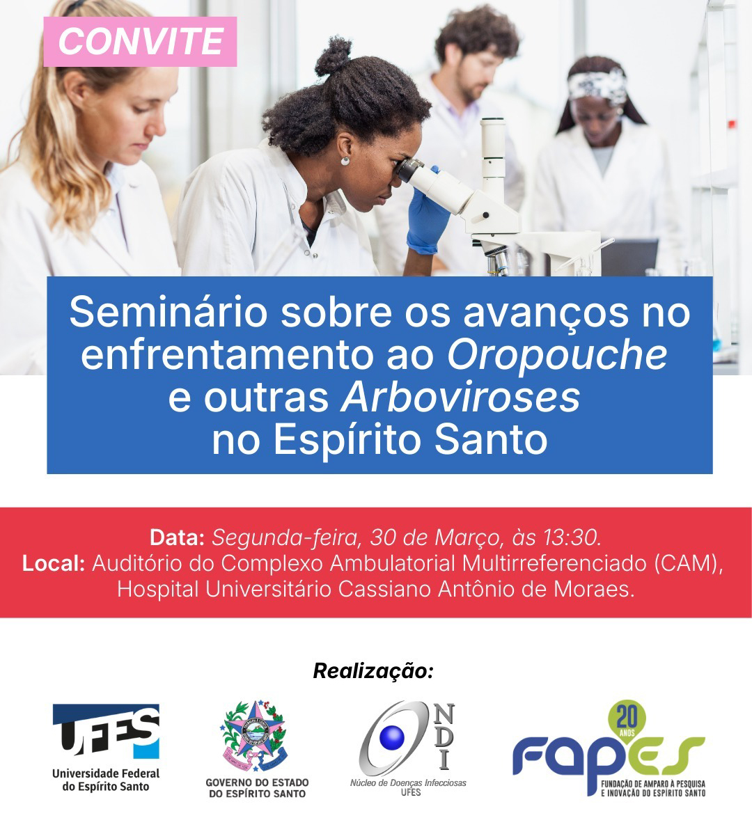 A Ufes realizará, no próximo dia 30, o seminário de atualização do Projeto de Enfrentamento ao Oropouche e outras Arboviroses no Espírito Santo, que tem como objetivo apresentar os avanços e as ações em andamento no âmbito da iniciativa. A programação terá início às 13h30, no auditório do Complexo Ambulatorial Multirreferenciado, localizado no campus de Maruípe. O evento é gratuito e pessoas interessadas em participar podem se inscrever por meio deste link.