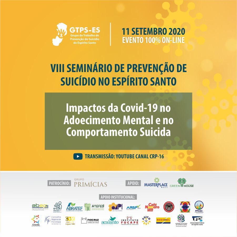 O Grupo de Trabalho de Prevenção do Suicídio no Estado do Espírito Santo (GTPS-ES) realiza, nesta sexta-feira, 11, o VIII Seminário de Prevenção de Suicídio no Espírito Santo, que abordará o tema Impactos da COVID-19 no Adoecimento Mental e Comportamento Suicida. O evento, que faz parte da programação da campanha Setembro Amarelo, será realizado das 9 horas às 18h20, totalmente on-line e com acesso gratuito.