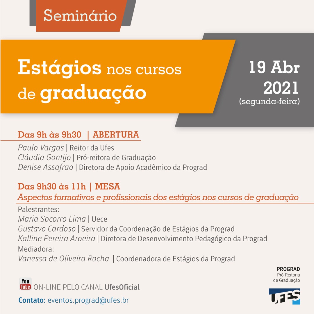 A Pró-Reitoria de Graduação (Prograd) promoverá na próxima segunda-feira, 19 de abril, o seminário on-line Estágios nos cursos de graduação, para debater sobre os aspectos formativos e profissionais dos estágios obrigatórios e não obrigatórios. Segundo a pró-reitora de graduação, Cláudia Gontijo, a mesa que dará início ao evento abordará os estágios considerando aspectos educativos essenciais para a formação de profissionais, aspectos legais que envolvem a oferta dos estágios e também os aspectos pedagógicos. Essa primeira parte do Seminário, aberta ao público em geral, será transmitida das 9 às 11 horas, pelo canal UfesOficial, no YouTube.