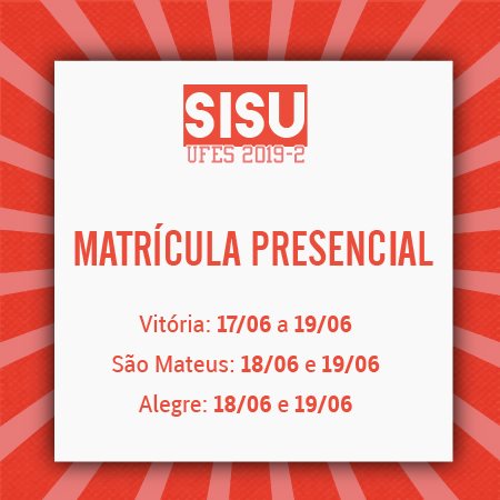 Vai até esta quarta-feira, 19, o prazo para a confirmação de matrícula presencial dos candidatos convocados na chamada regular do Sisu/Ufes 2019-2. A confirmação começou nesta segunda-feira, 17, e os convocados devem verificar a data, o local e o horário da sua matrícula no anexo II do edital, clicando aqui.