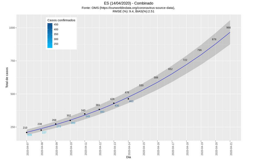 A partir daí, as informações são apresentadas em formatos que mostram o crescimento exponencial, o qual busca capturar o crescimento do número de casos, e o crescimento logístico, que permite perceber a aceleração ou desaceleração da transmissão. Com base nesses dois modelos, os pesquisadores apresentam o que chamaram de “modelo combinado”, que apresenta a média dos casos estimados pelos dois modelos anteriores (na imagem, projeção do modelo combinado com dados de 14 de abril de 2020). Também são realizadas e apresentadas projeções do número de casos da COVID-19 para os próximos sete dias, a partir dos casos relatados, conforme a equação de cada modelo, e sua respectiva margem de erro.