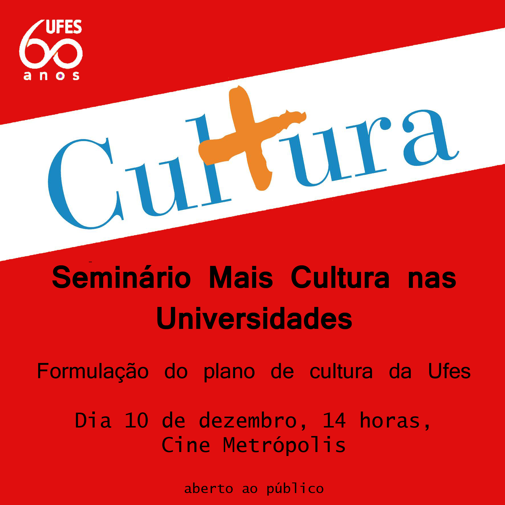 A Superintendência de Cultura e Comunicação (Supecc) da Ufes, em parceria com a Pró-Reitoria de Extensão (ProEx), promovem na próxima quarta-feira, dia 10 de dezembro, às 14 horas, no Cine Metrópolis, o Seminário Mais Cultura nas Universidades. No evento, que é aberto ao público, será discutido o plano de cultura que a Ufes apresentará ao Edital Mais Cultura nas Universidades, lançado pelo MEC em parceria com o MINC.