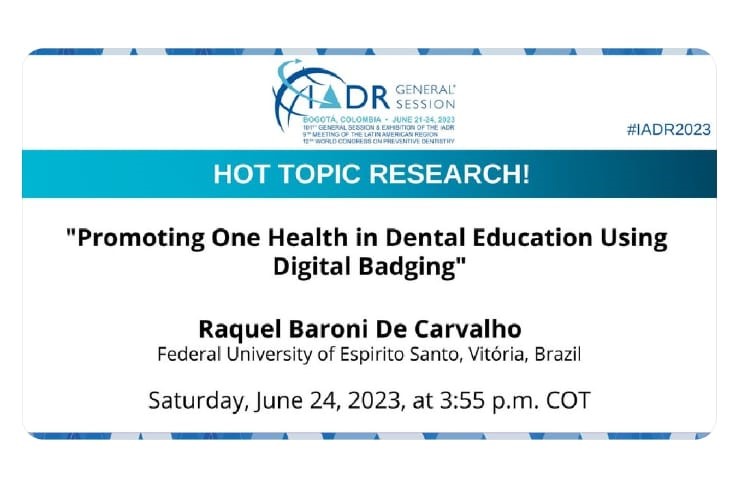 O trabalho Promoção da saúde na educação odontológica usando crachá digital, da professora do Departamento de Medicina Social da Ufes Raquel Baroni, foi destaque na 101ª Sessão Geral e Exposição da IADR (sigla em inglês para Associação Internacional de Pesquisa Dentária, Oral e Craniofacial), o mais importante congresso mundial na área de pesquisa odontológica. O congresso aconteceu em Bogotá (Colômbia), em junho, e o estudo chegou a ser citado como hot topic research (pesquisa sobre assunto em alta) em rede social do evento (foto).