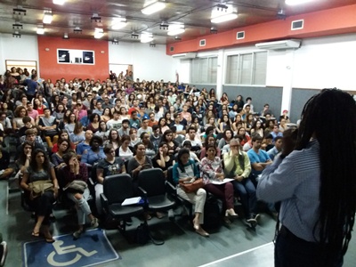 Após as apresentações da Reitoria e pró-reitorias, o professor do Centro de Educação Gustavo Forde (na foto, falando aos estudantes) proferiu a palestra de abertura do semestre. O tema escolhido para o ano de 2017 foi “Juventude, pluralidade e alteridade”, que abordou os diversos sentidos da juventude e a diversidade de saberes e culturas que constituem a universidade. “Fica o convite para que cada um de nós possa fortalecer e ampliar a Ufes como uma comunidade de alteridade, que é a capacidade de se colocar no lugar do outro e dialogar com o outro”, propôs o professor.