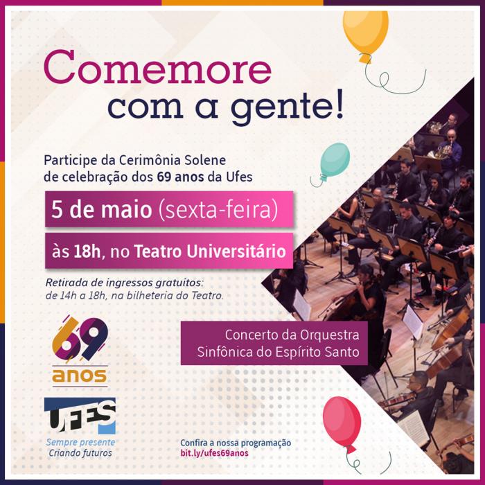 Comemorado no dia 5 de maio, o aniversário da Ufes terá uma convidada especial. Trata-se da Orquestra Sinfônica do Espírito Santo (Oses), que sobe ao palco do Teatro Universitário para um concerto em homenagem aos 69 anos da Universidade nesta sexta-feira. Com presença do reitor da Ufes, Paulo Vargas, do vice-reitor, Roney Pignaton, e demais autoridades da comunidade acadêmica, a cerimônia terá início às 18 horas.