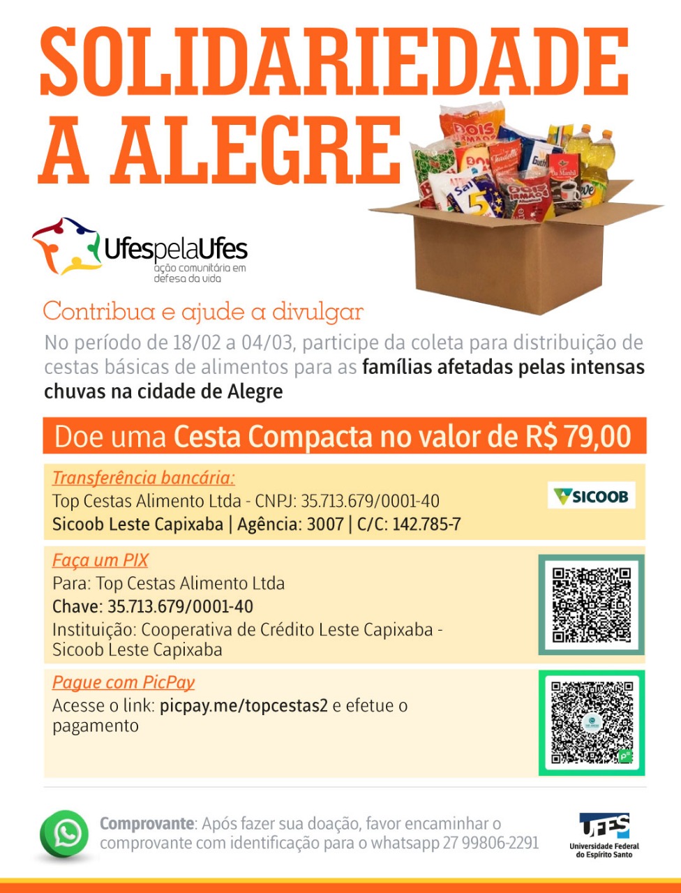 A comunidade universitária da Ufes criou uma ação solidária destinada a ajudar a população atingida pelas fortes chuvas que caíram sobre o município de Alegre nesta semana e deixaram centenas de pessoas desabrigadas ou desalojadas e inúmeros prejuízos no município. A campanha é desenvolvida por iniciativa dos servidores da Ufes, por meio do projeto Ufes pela Ufes, e visa angariar cestas básicas para serem fornecidas às pessoas e famílias em situação de vulnerabilidade devido ao impacto das chuvas.