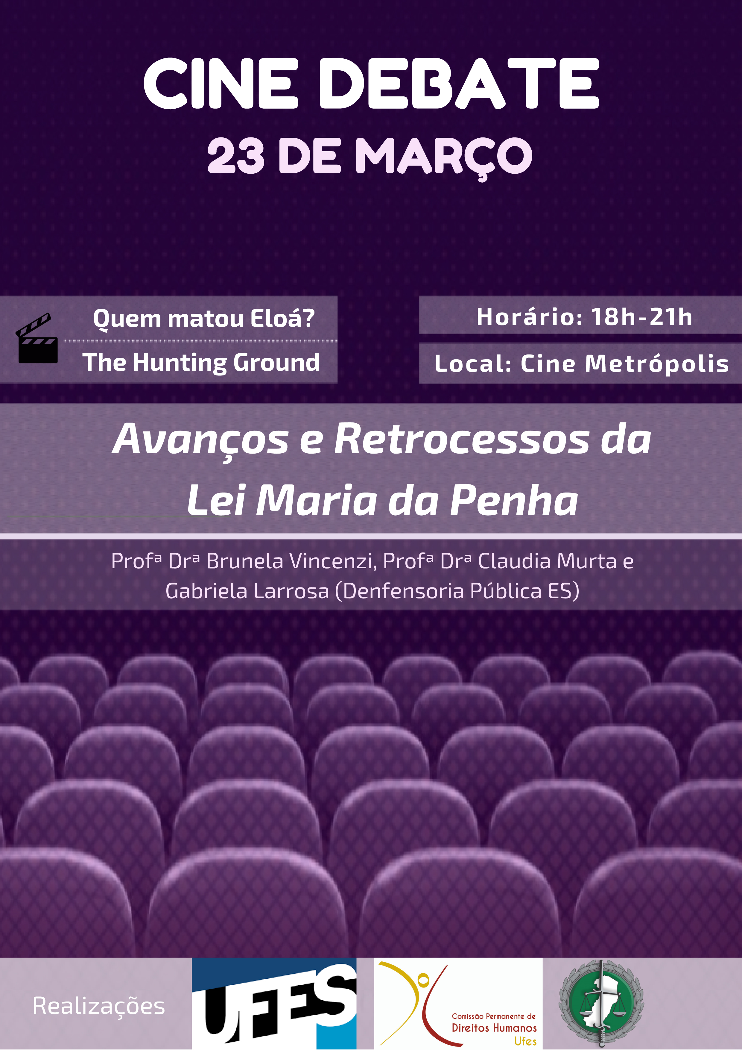 Como parte das atividades pelo Dia Internacional da Mulher – comemorado no último dia 8 – a Comissão Permanente de Direitos Humanos (CPDH) da Ufes e a Defensoria Pública do Espírito Santo promovem um Cine Debate nesta sexta-feira, 23, das 18 às 21 horas, no Cine Metrópolis, no campus de Goiabeiras. Na primeira parte serão exibidos dois documentários premiados: o nacional Quem matou Eloá?, da diretora Lívia Perez, e The hunting ground, de Kirby Dick. Em seguida haverá debate com o tema “Avanços e retrocessos da Lei Maria da Penha”.