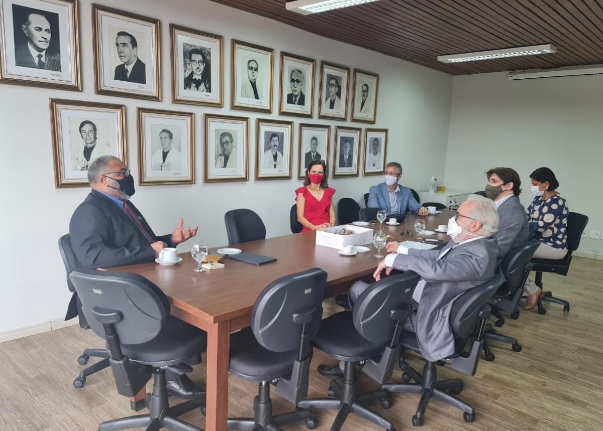 Na foto acima, o reitor Ribeiro Jorge em reunião com a pró-reitora de Administração, Teresa Carneiro; o vice-reitor Roney Pignaton; a chefe de gabinete, Zenólia Figueiredo; o pró-reitor de Planejamento e Desenvolvimento Institucional, Rogério Faleiros; e o reitor Paulo Vargas.